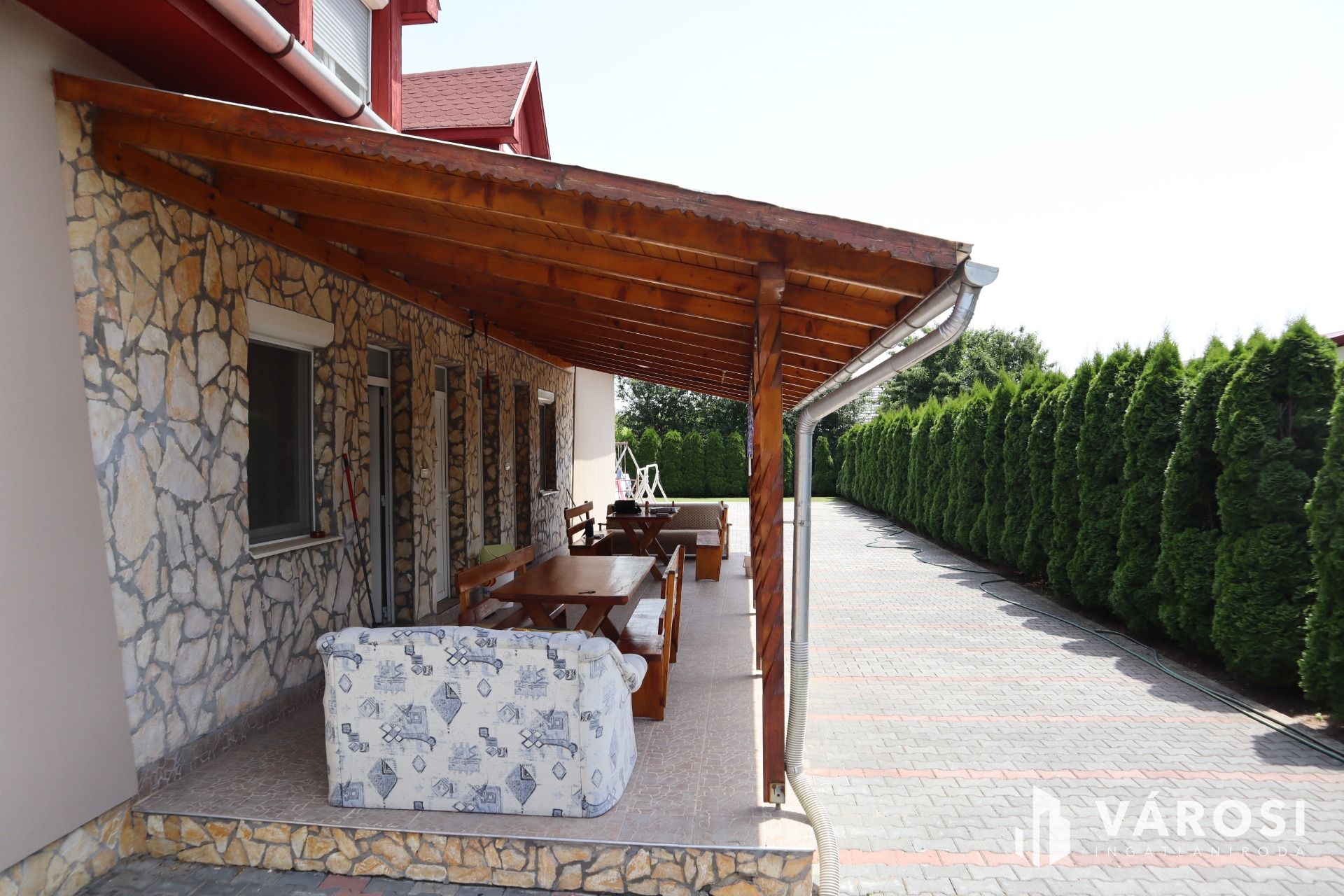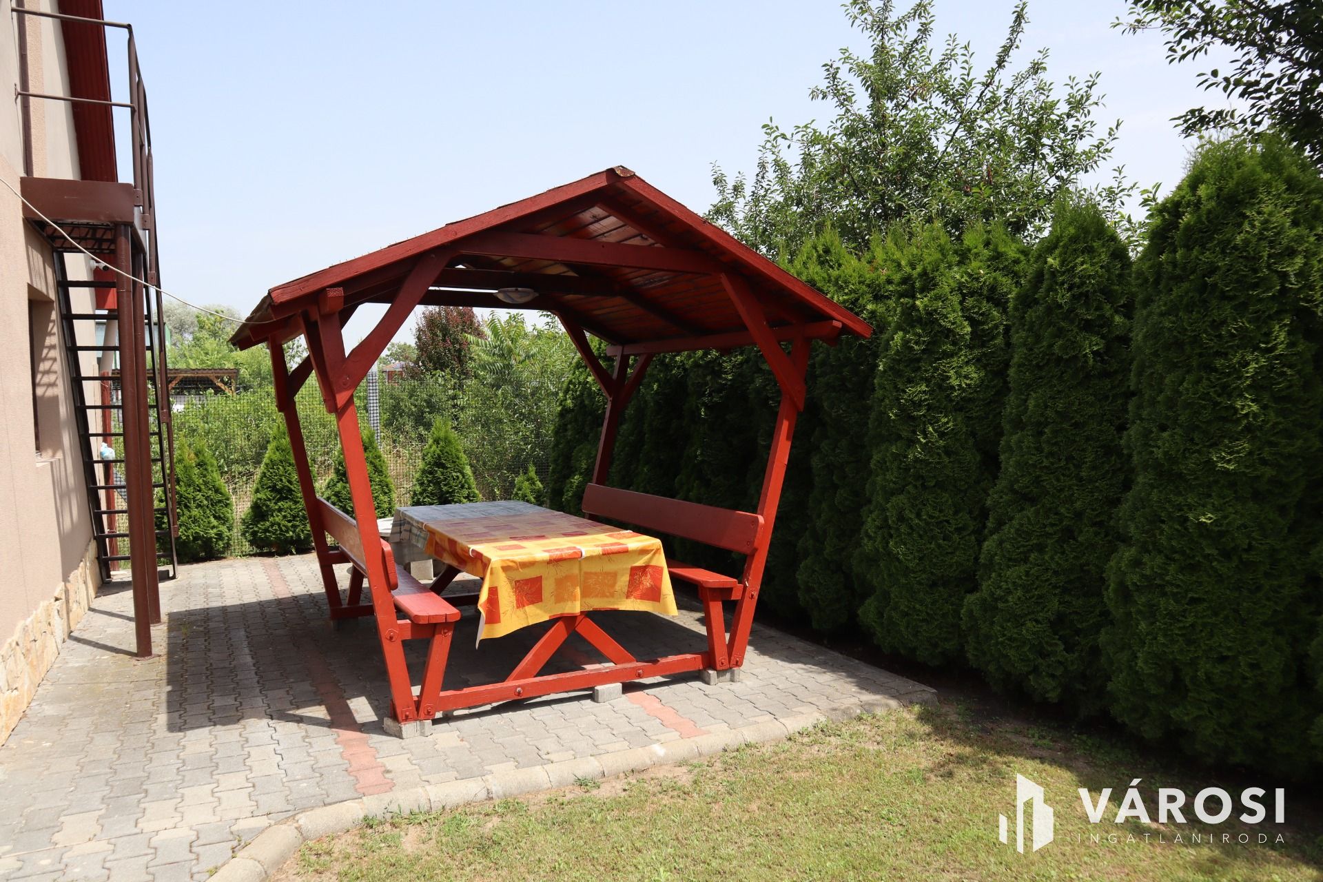 Csendes utcában, zöld övezetben helyezkedik el, a parkosított kertben minden adott a nyugodt kikapcsolódásra. Kialakításra került egy kerti grillezőhely, továbbá egy kétállásos garázs, amely jelenleg tárolóként funkcionál. A térkövezett udvaron akár 4 autó részére is biztosított a parkolás.