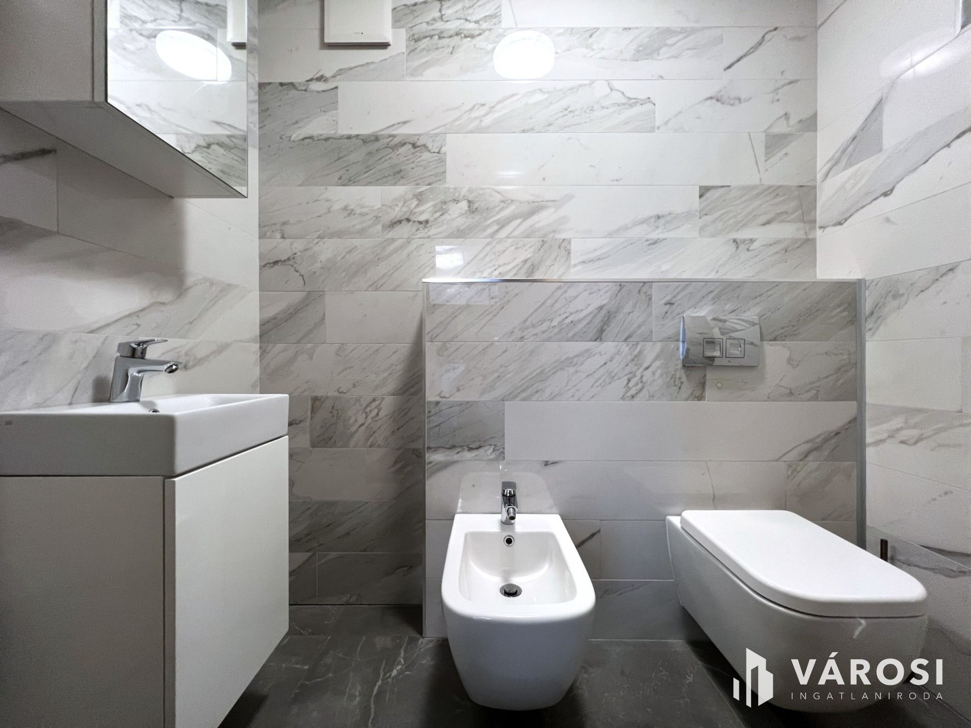 A földszinten található egy minden igényt kielégítő amerikai konyhás nappali, egy tágas kádas fürdőszoba wc-vel, gardrób, külön wc-bidé, közlekedő-mély pakolható gardrób szekrényekkel, továbbá egy világos modern hálószoba.