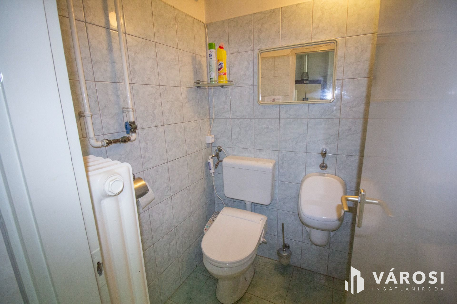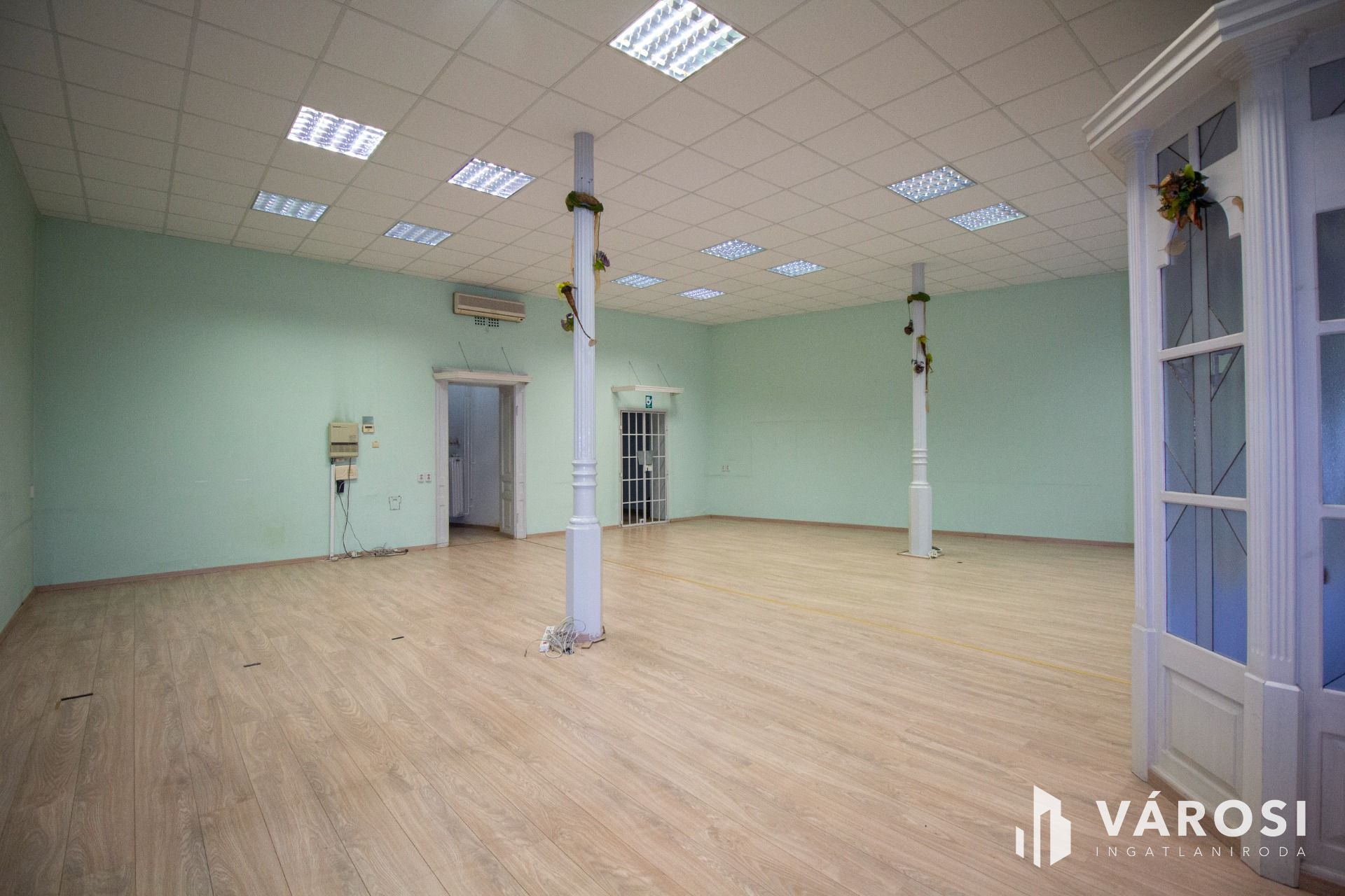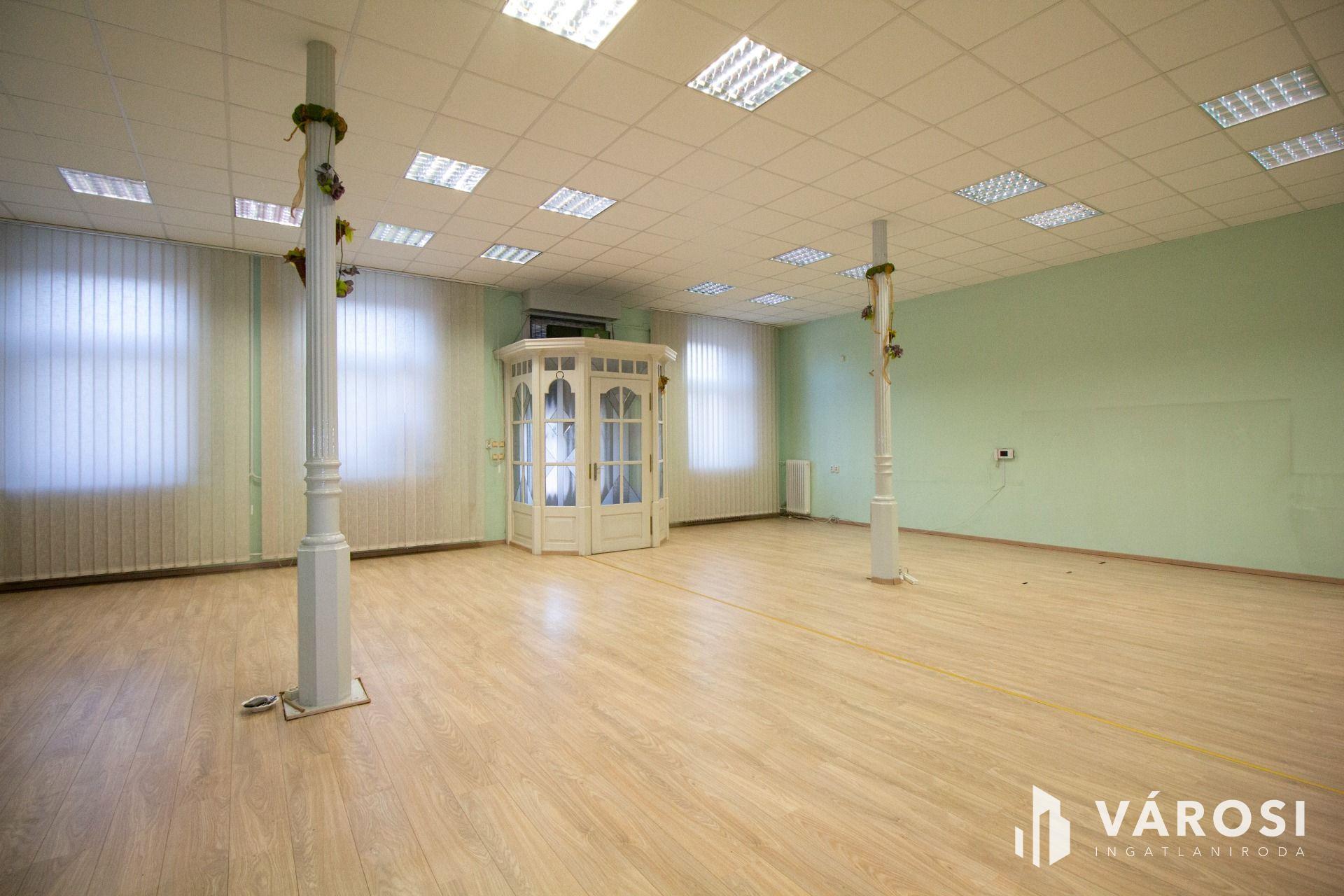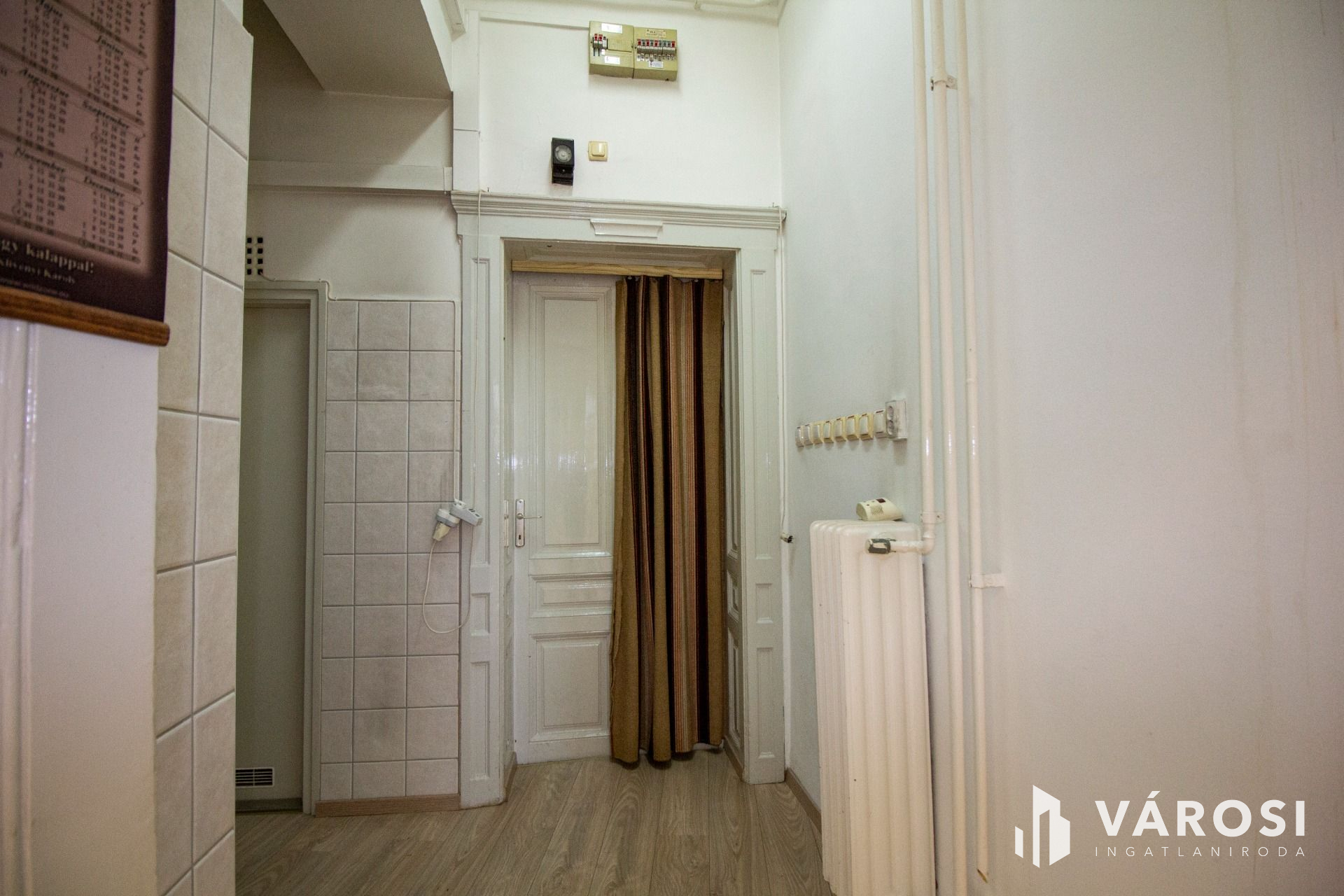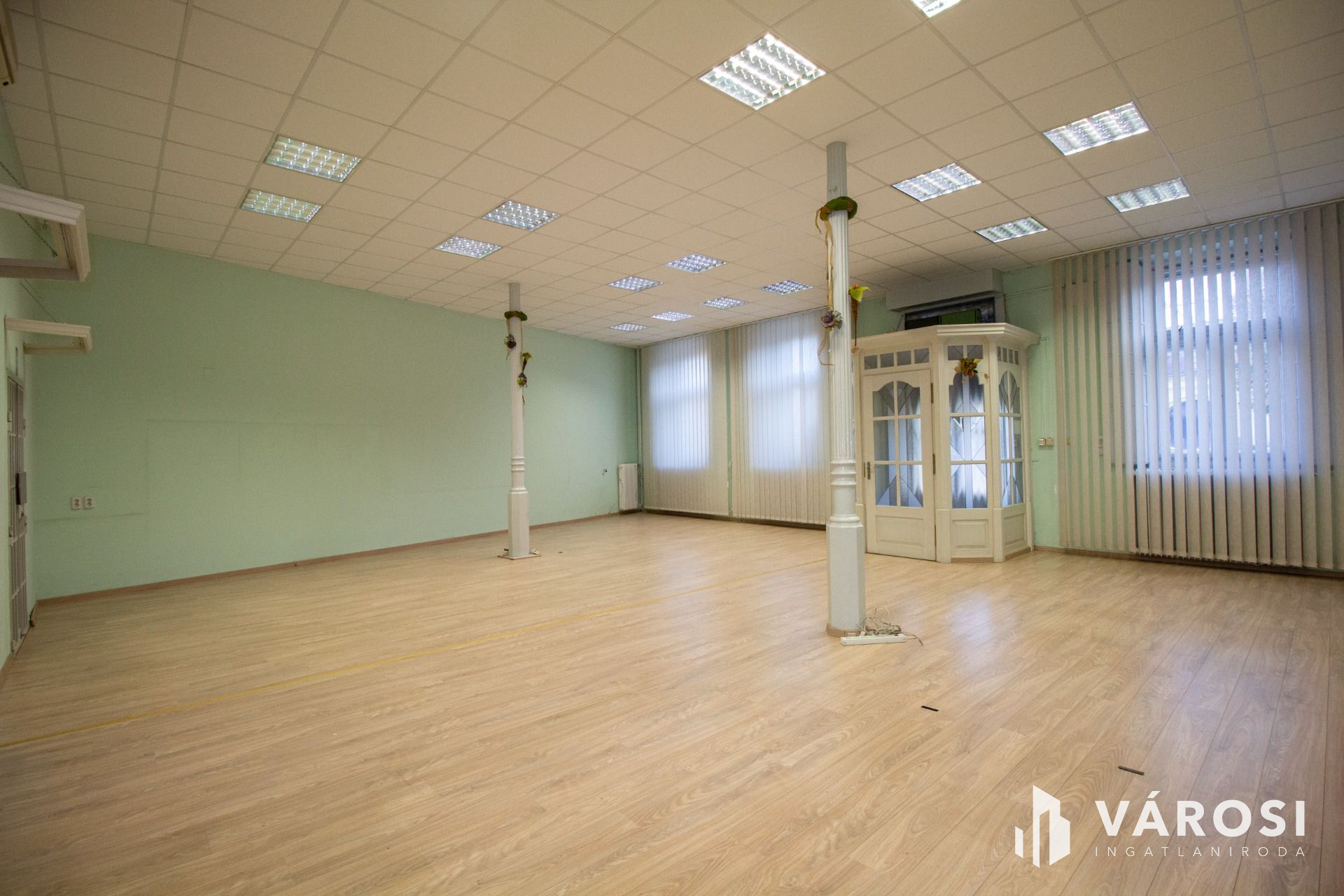 A klimatizált 96 nm-es nagyobb helyiség laminált burkolatú és a nagyméretű nyílászáróin szalagfüggöny lett felszerelve. Tovább haladva a folyosóról nyílik a teakonyha, ami mosogatógéppel felszerelt, és a felújított WC, mely egyben bidé is.
