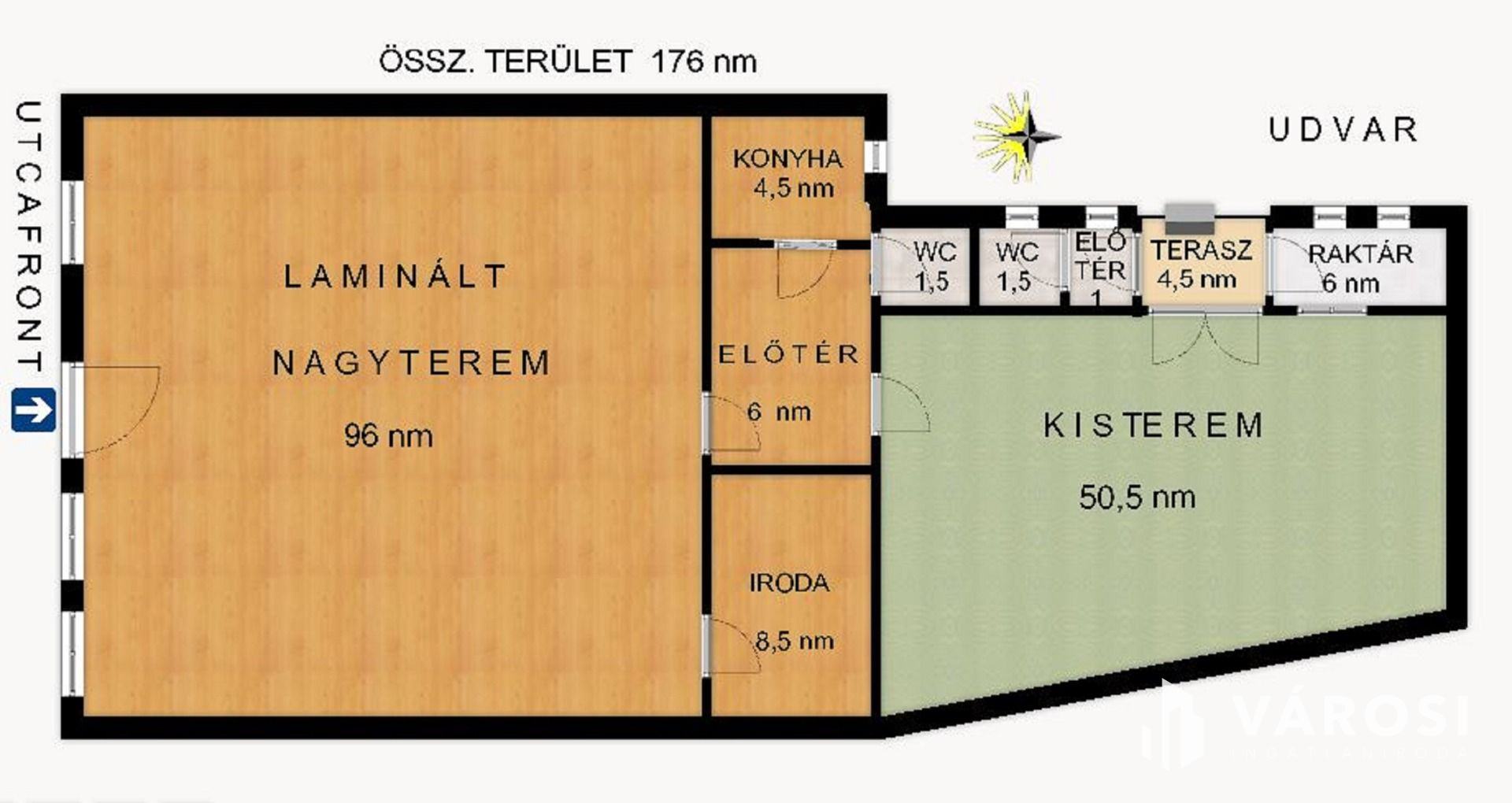 A hátsó részben található egy 50 nm-es terem, plusz külön WC, terasz, raktár.