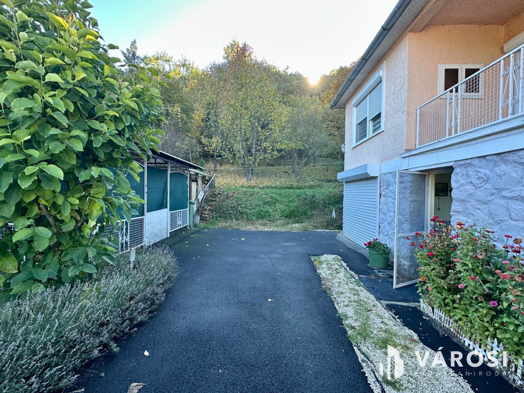 Helyiségei: az alsó szinten konyha, étkező, kamra, külön nyíló W.C., közlekedő, kazánház, garázs (elektromos kapuval), a felső szinten 4 szoba, közlekedő, 2 fürdőszoba.