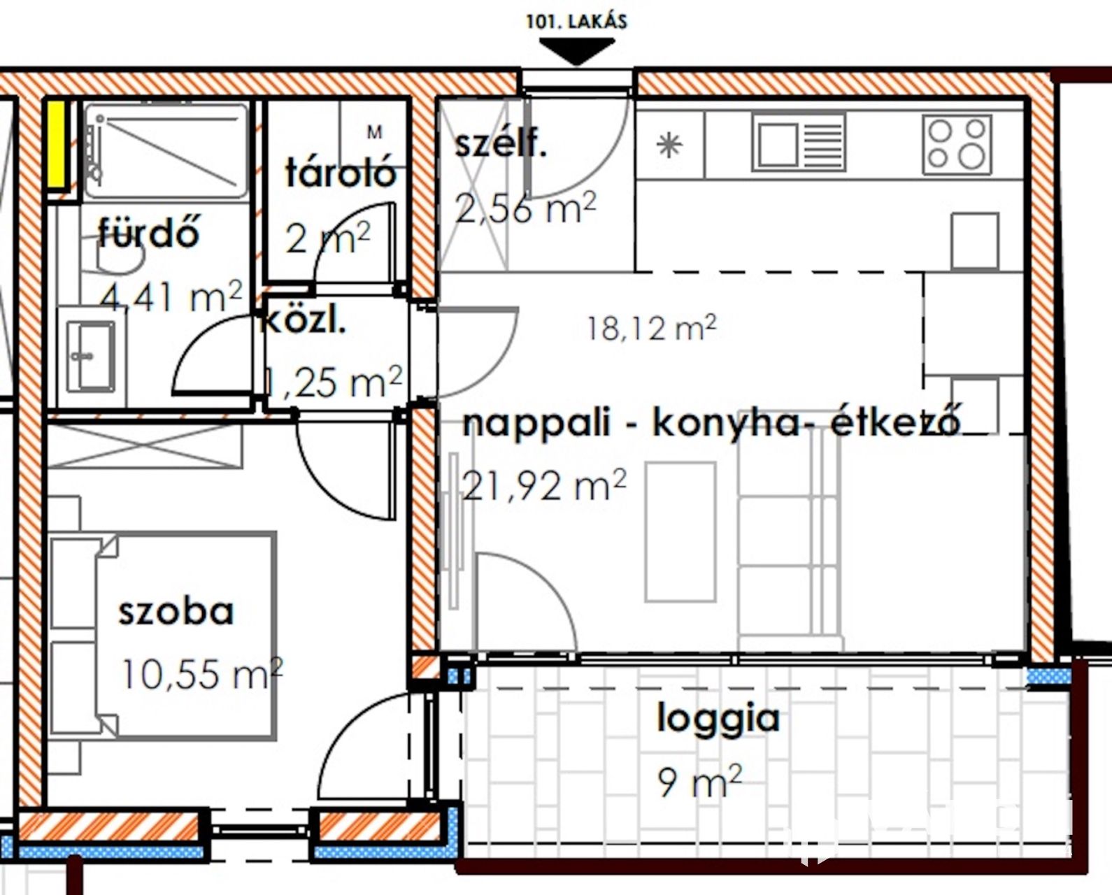 A 1 db amerikai konyhás nappalival, 1db hálószobával, 1 db fürdőszobával, közlekedővel, loggiával rendelkezik.