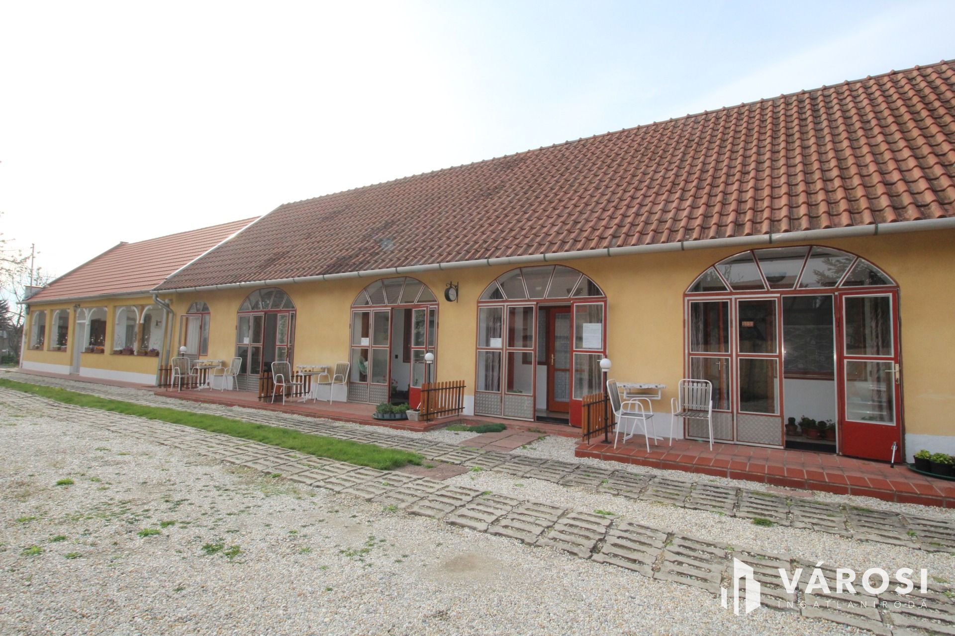Jelenleg a vendégek számára kialakított parkolók és egy fedett terasz, tároló helyiség valamint 3 garázs kapott helyett, hátul kellemes pihenőkert résszel.