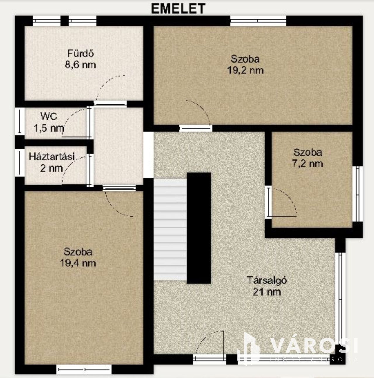 Az emeleten egy világos társalgó fogad, süllyesztett könyvespolccal, hatalmas ablakokkal. Innen nyílik két nagyméretű-, és egy kisebb dolgozószoba, valamint fürdő, külön WC és háztartási helyiség. A terek arányai és a fények játéka minden napszakban különleges hangulatot adnak.