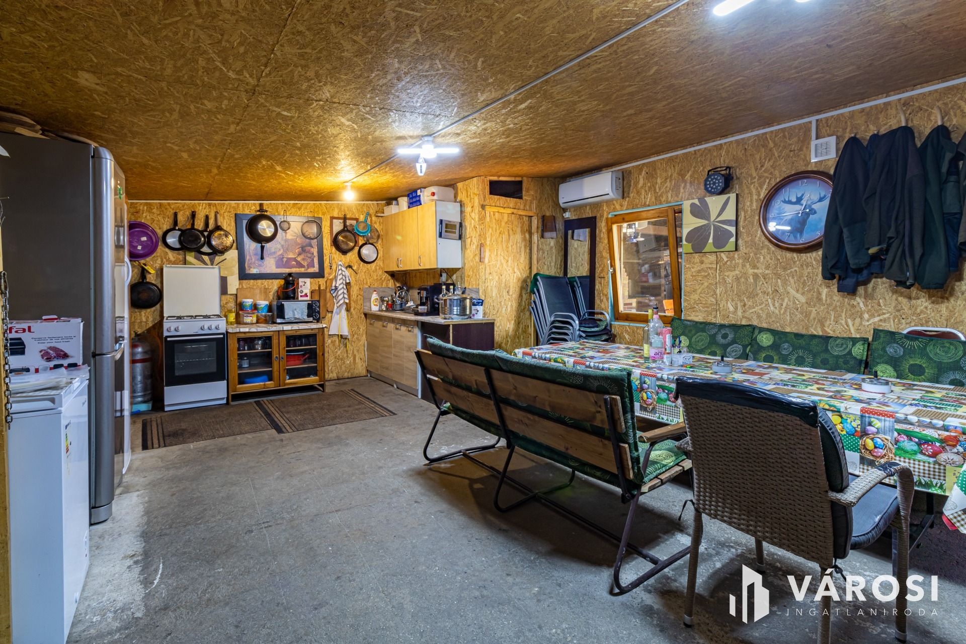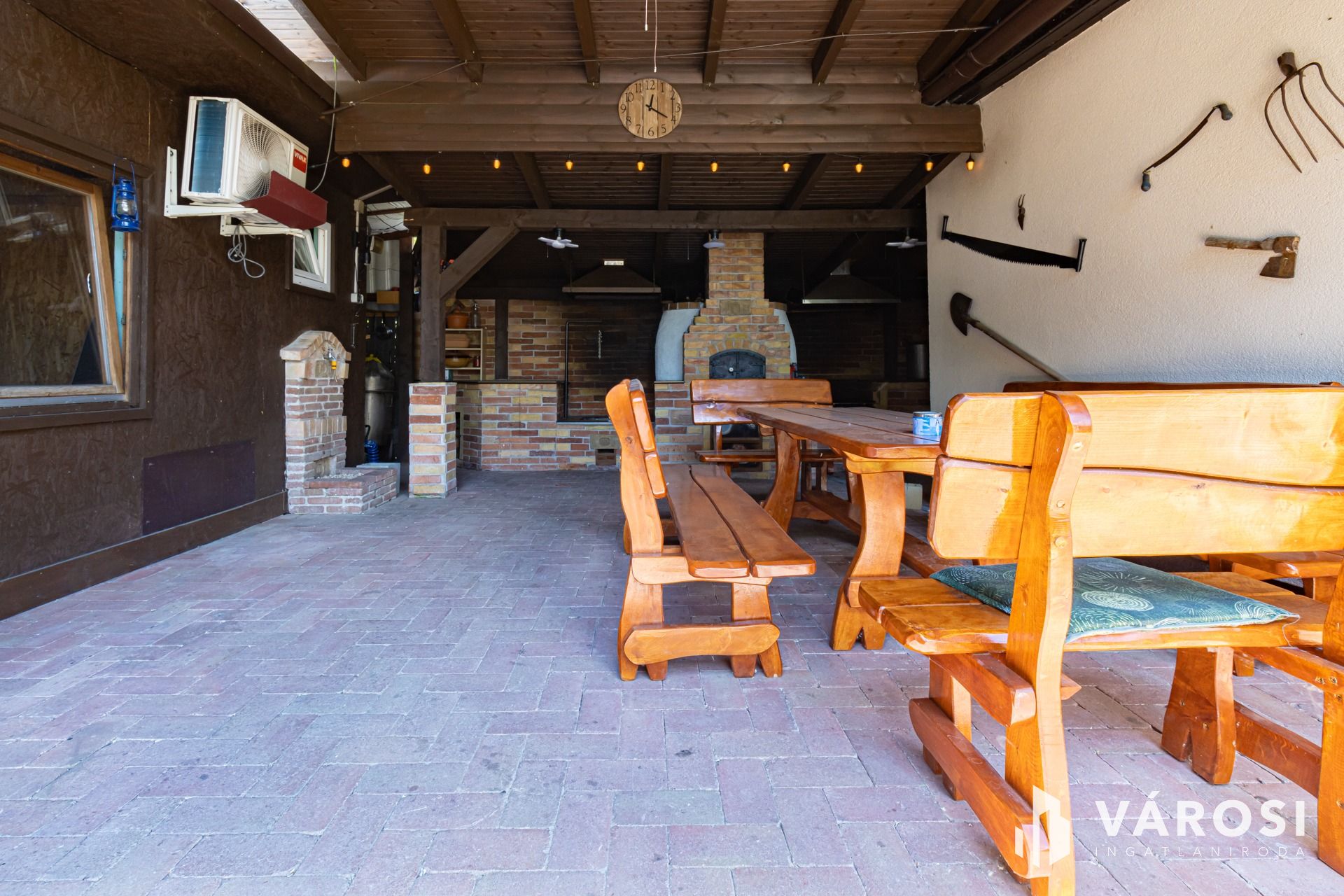 Ki lett alakítva egy három állásos, fedett autóbeálló, egy kemence, grillező és bográcsozó is, ami szintén fedett és mellé egy sörpados étkező is el tudott férni.