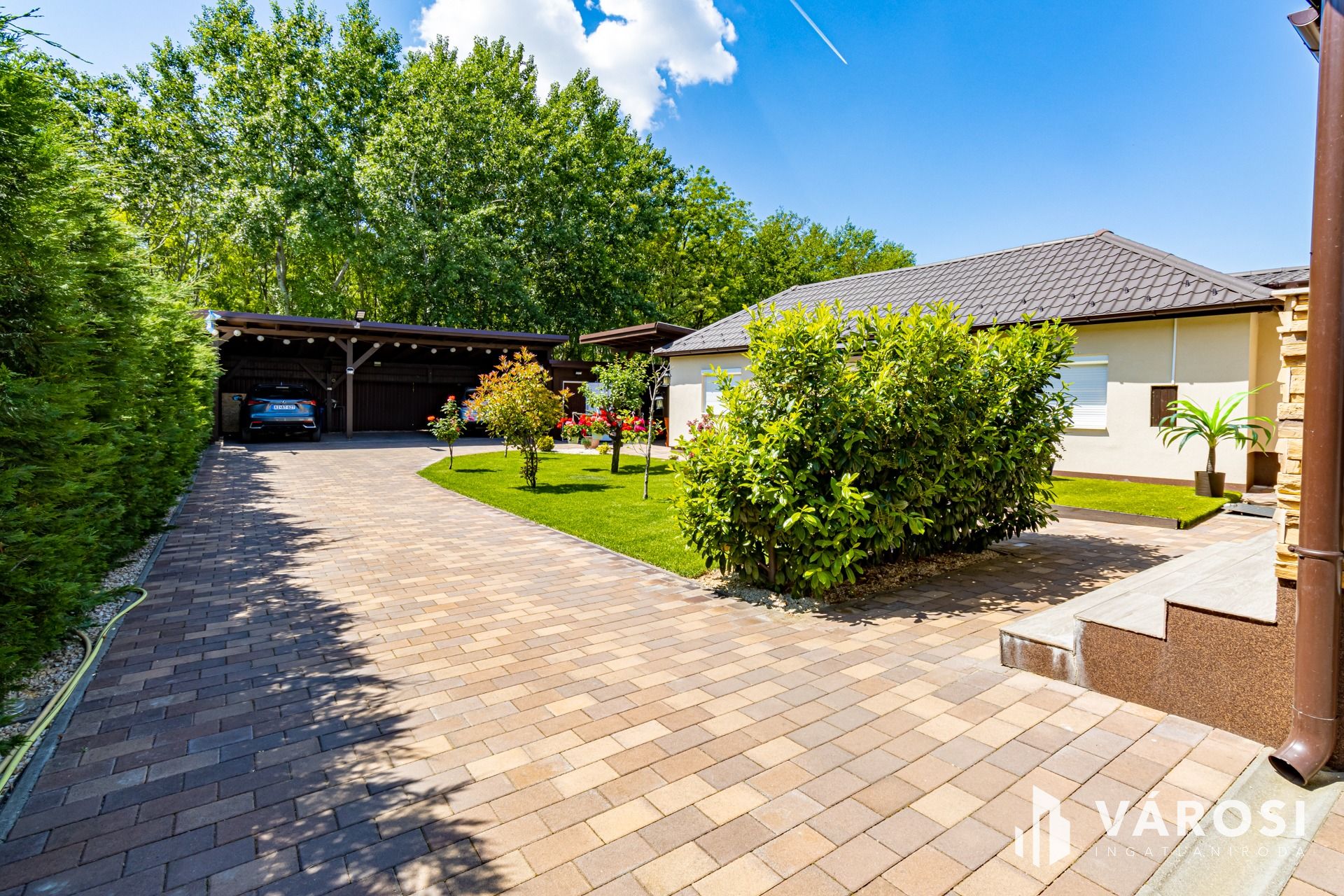 A telek többi része térkövezett, egy része füvesített és dísznövényekkel telepített, automata öntözőrendszerrel, elektromos kertkapuval szerelt.