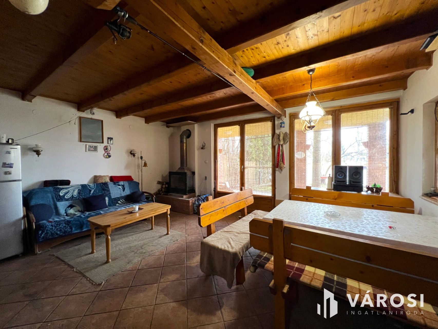 A természet közeliség megjelenik a házon belül is, sok faanyag került beépítésre, gerendázott mennyezete is az otthonosság érzetét növeli.