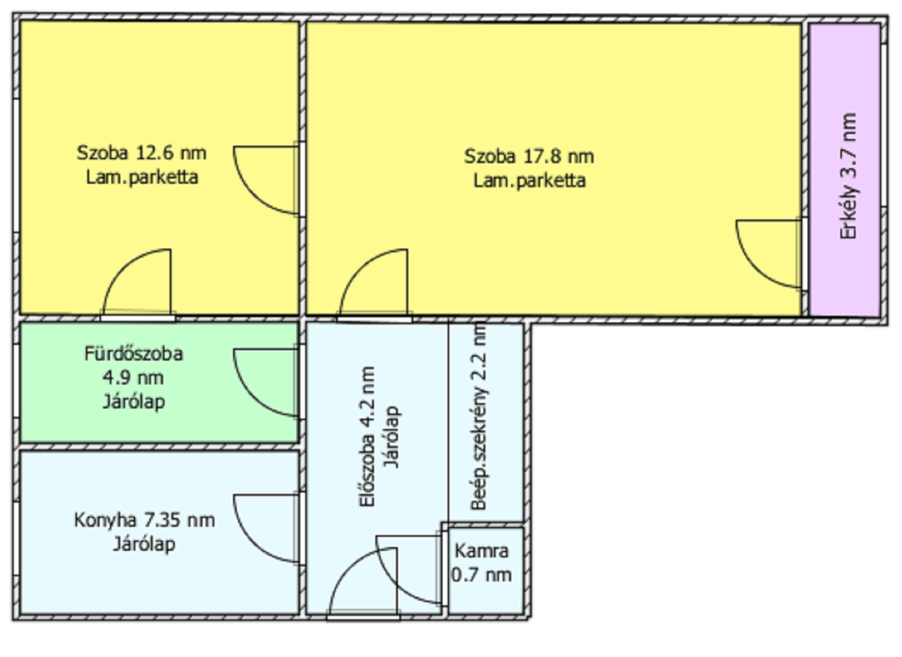 Helyiségei: 2 szoba, konyha, kamra, előszoba, fürdőszoba, erkély.