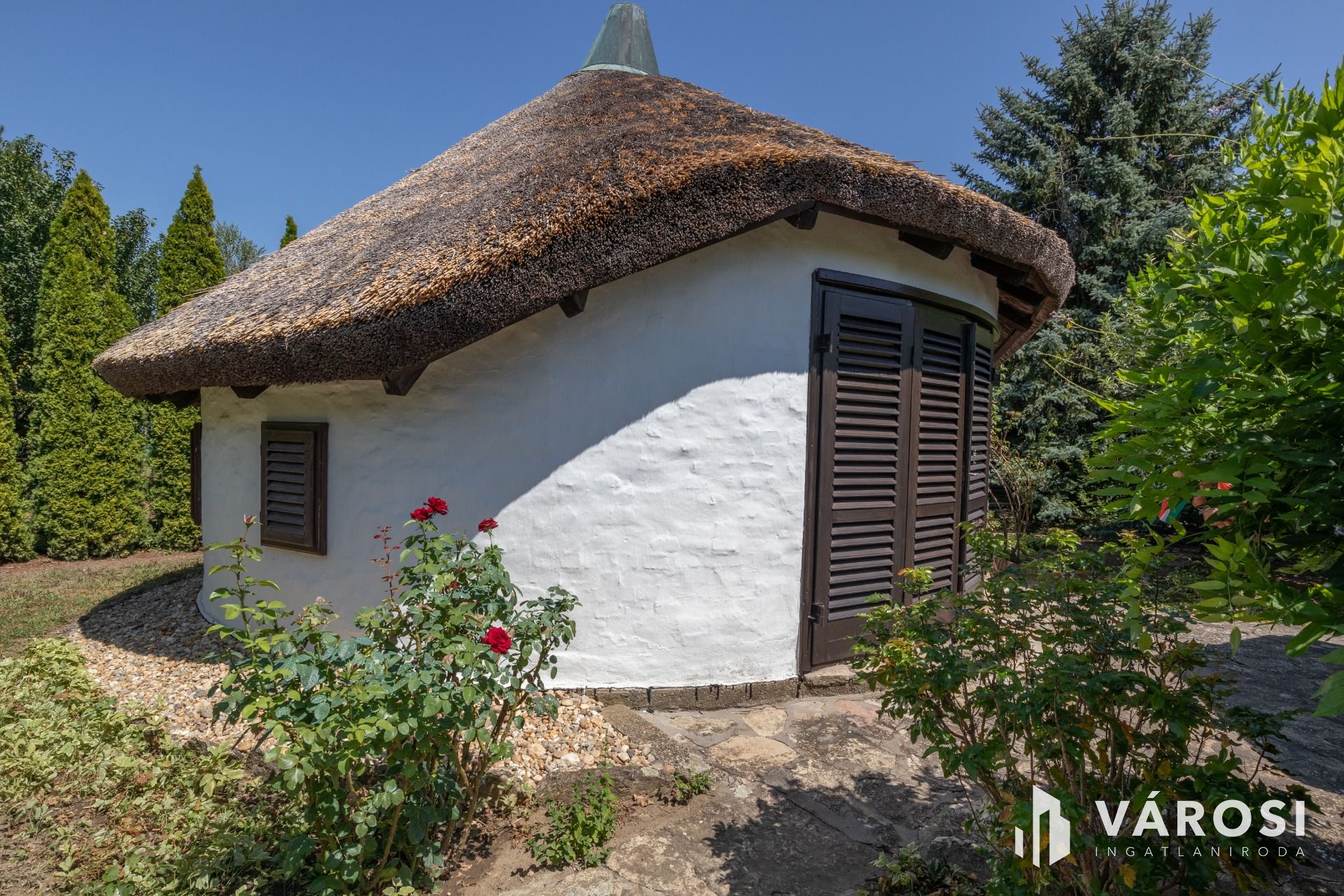 Egy egyedi kivitelezésű '70-es végén Ybl díjas tervező által tervezett 30 m² alapterületű nádfedeles, téglából épült házikó található a telken, amit akár vendégháznak is lehet használni. A szélfogóból belépve egy légtérben egy tágas szoba, ötletes kinyitható konyharésszel, a galérián két fő kényelmesen tud aludni. Fürdőszobában tuskád zuhanyzóval, mosdóval és WC-vel ellátott.