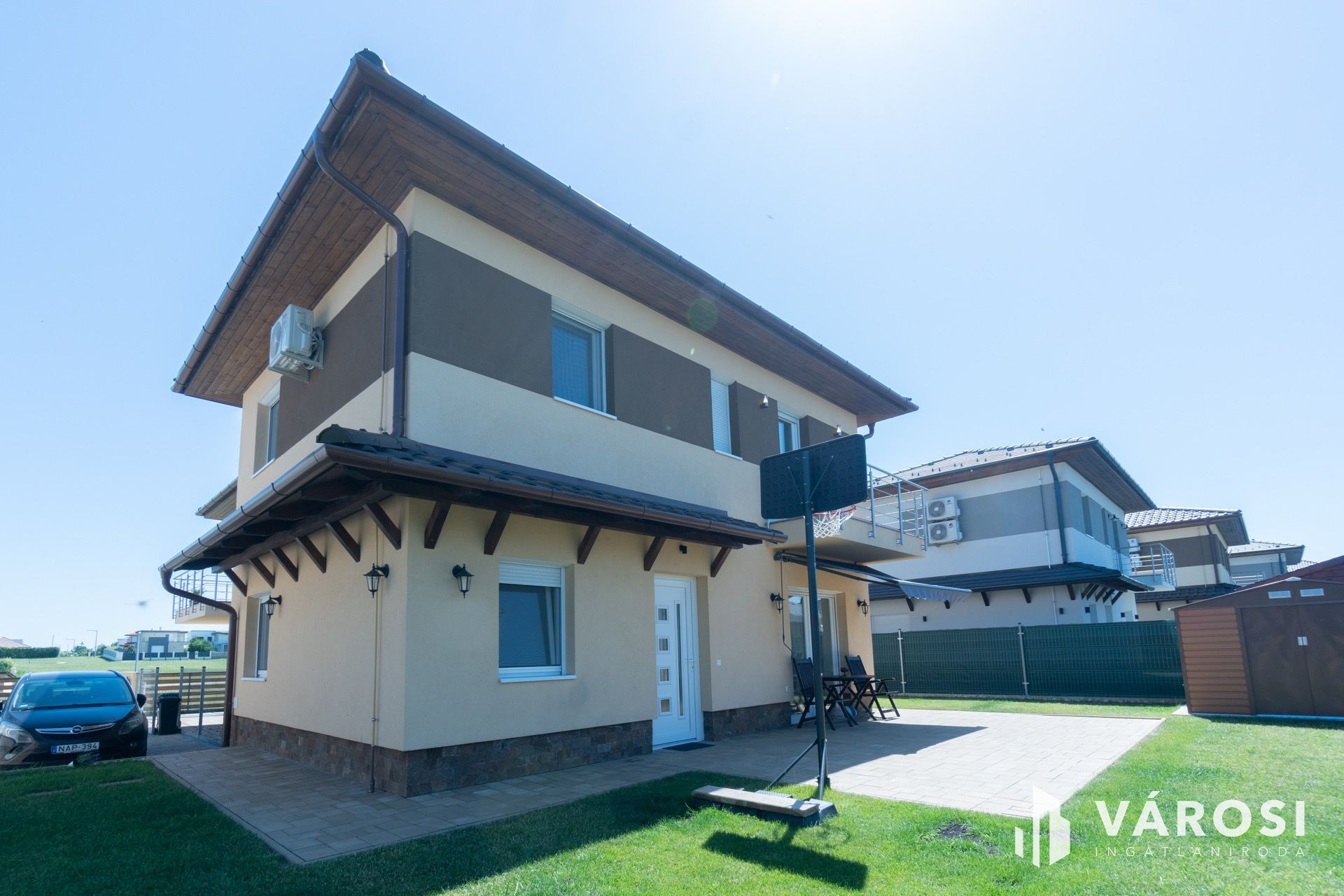 Siófok - Sóstó új építésű lakóparkjában első tulajdonostól eladó egy 2020-ban épült újszerű, kiváló állapotban lévő ikerház. Precízen átgondolt, rendkívül praktikusan megtervezett bruttó 107 m²-es házról van szó, melyhez 19 m² térkövezett terasz, egy 4 m²-es erkély, valamint udvaron belüli térkövezett gépjármű beálló tartozik. Az ingatlan külön helyrajzi számon van saját 266 m²-es telekhányaddal.