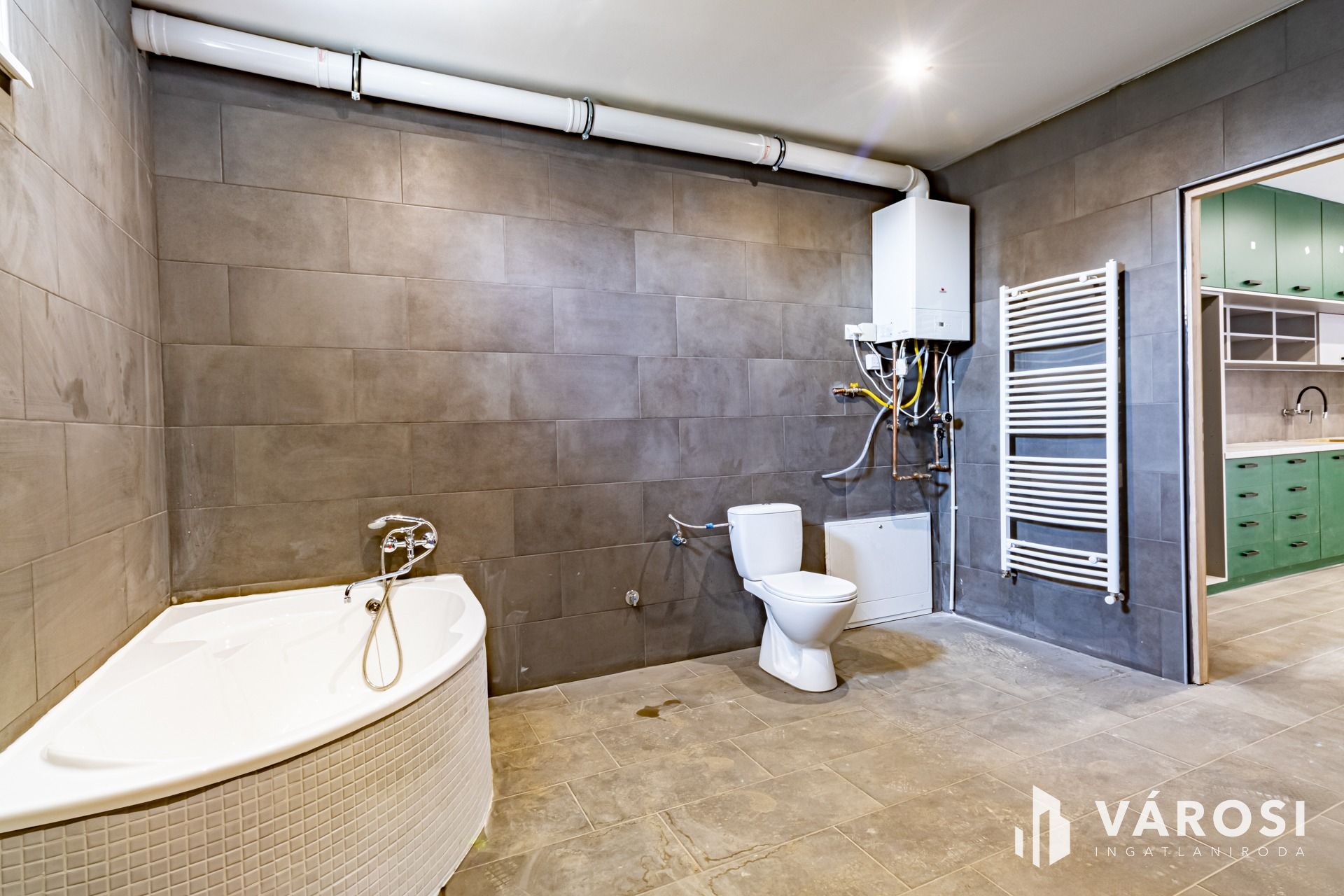 Az egész ingatlan alatt padlófűtést illetve radiátoros fűtést is beszereltek, amit gázcirkóval üzemeltetnek, ez szolgáltatja a melegvizet is.